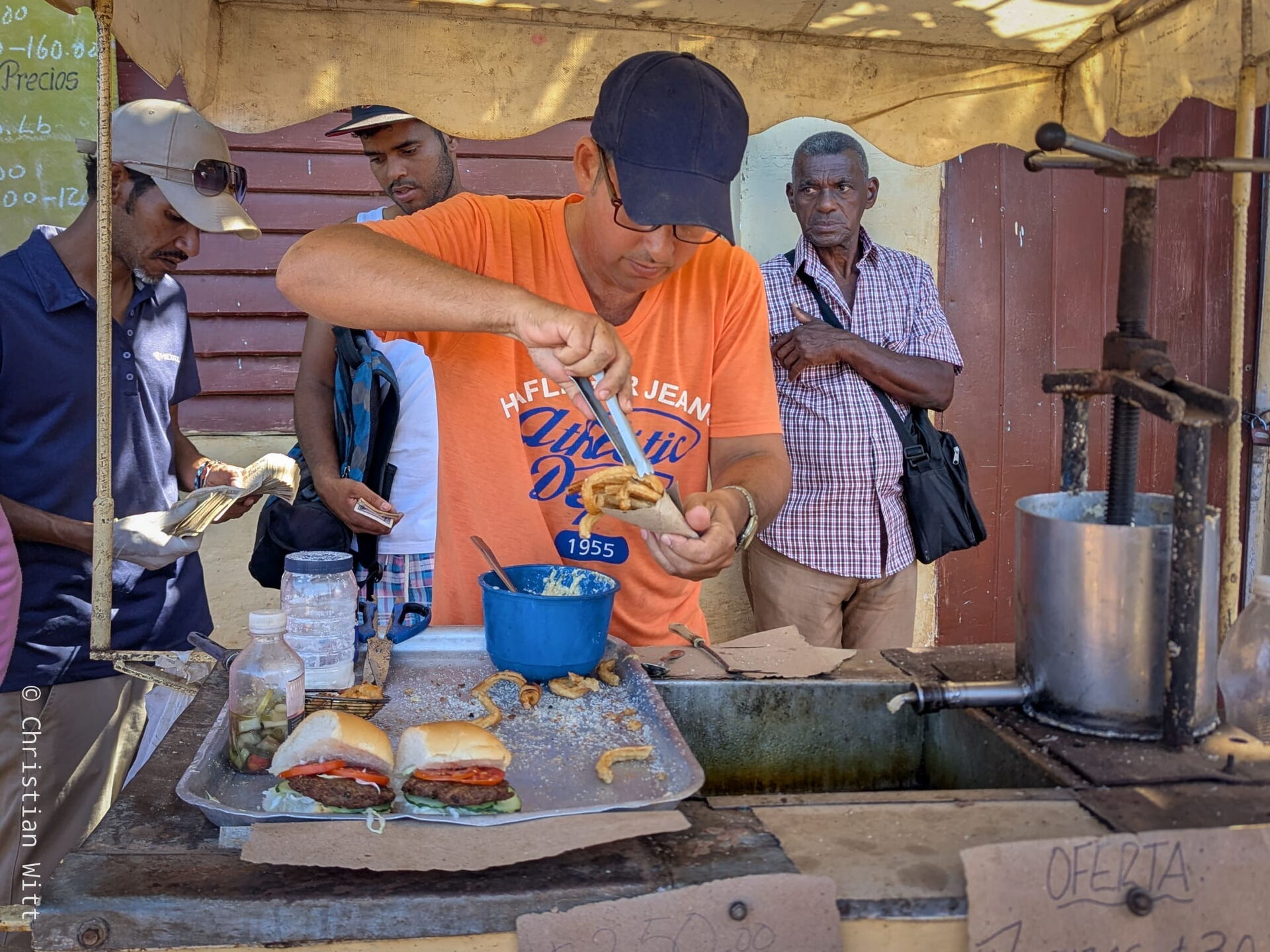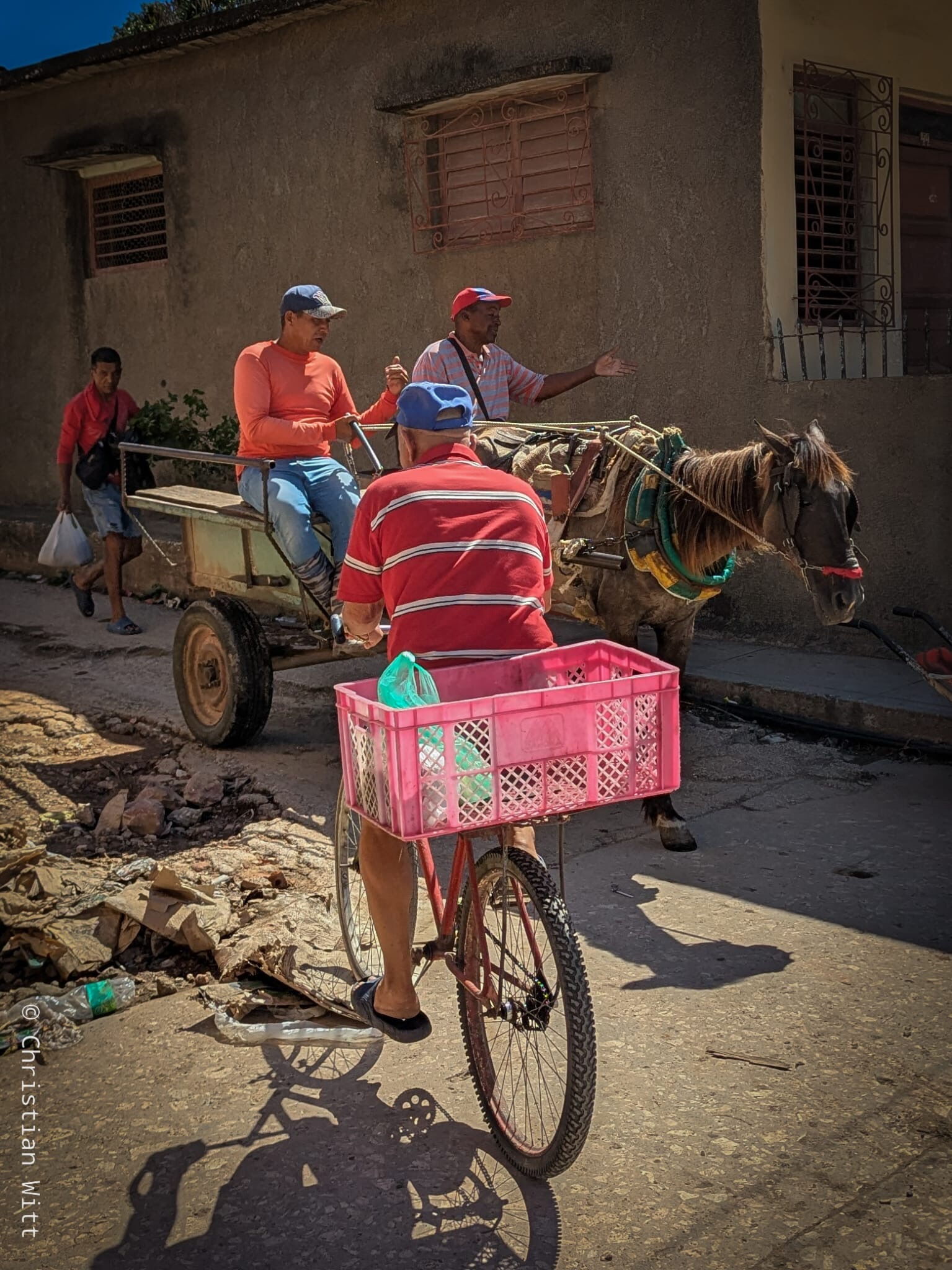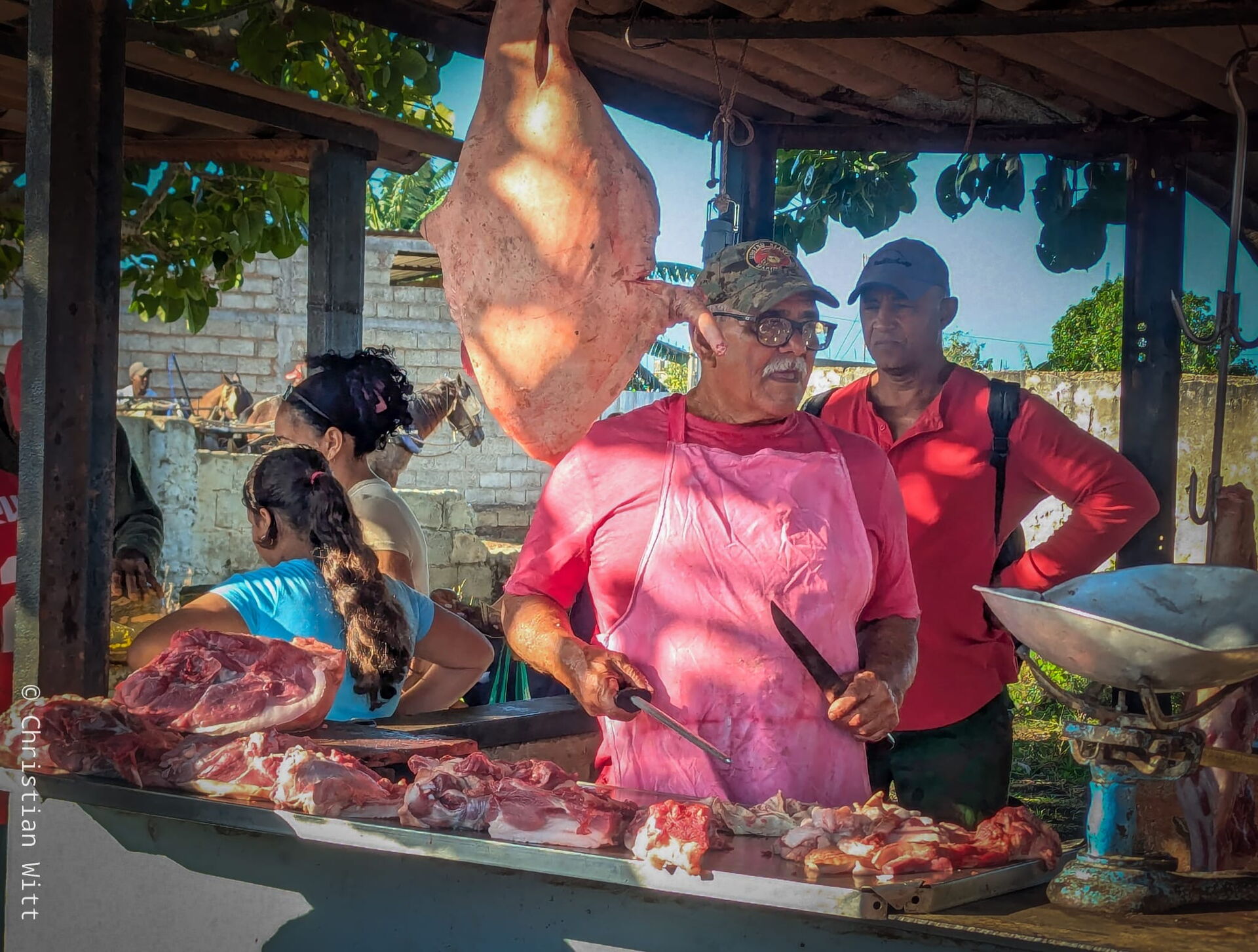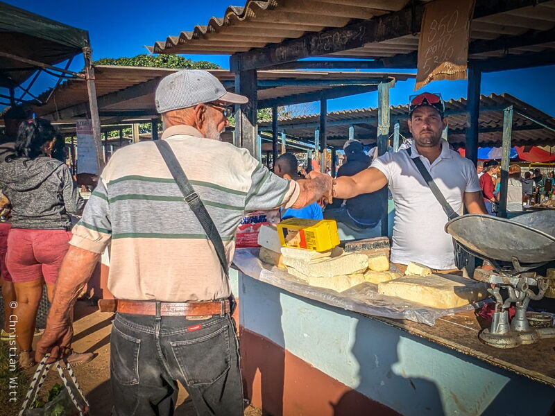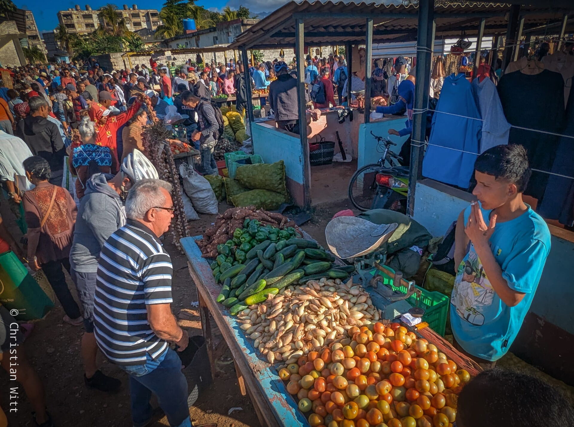 Die Stände und Fahrzeuge sind prall gefüllt mit Obst, Gemüse, Fleisch und Non-Food-Artikeln. Da die Zahl der Touristen überschaubar bleibt, lässt sich erahnen, dass sich viele Kubaner diesen Einkauf noch leisten können. Zahlreiche Besucher tragen prall gefüllte Tüten nach Hause.