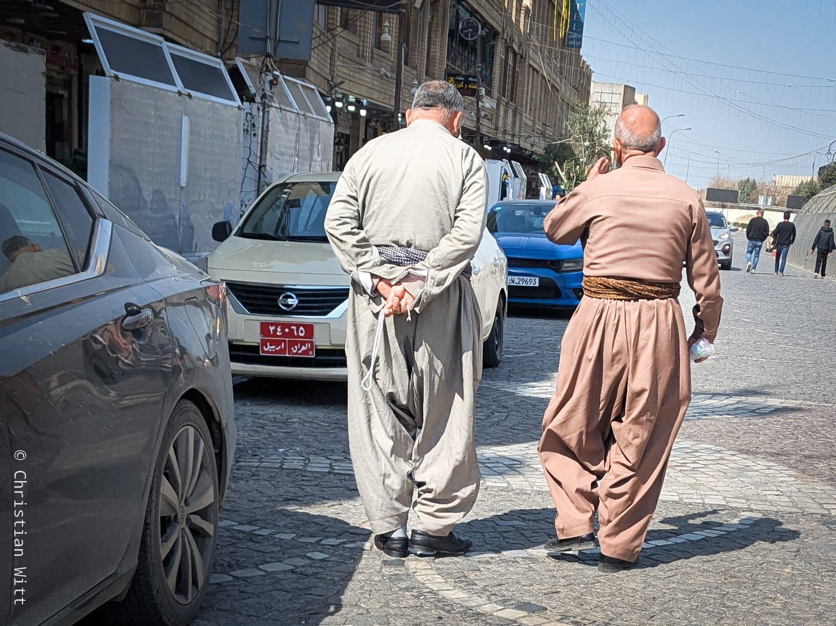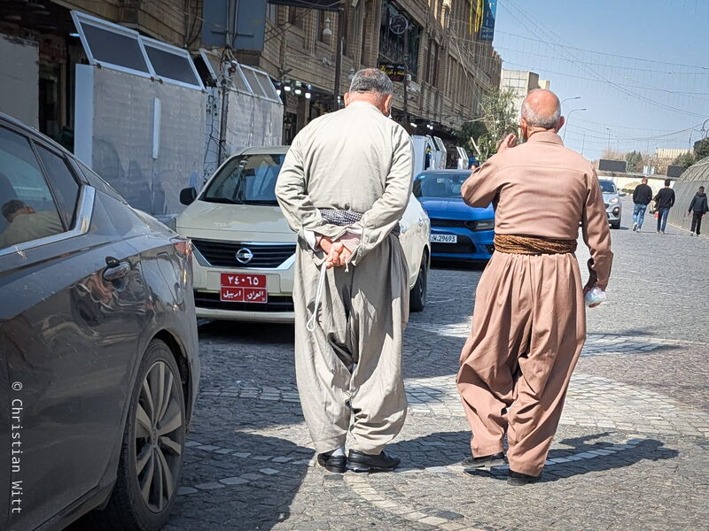 Hier sind alle sehr stolz auf ihr Kurdisch-Sein und viele hängen ihre kurdische Fahne mit der gelben Sonne raus. Ich habe auch etliche Ältere gesehen, die in kurdischer Tracht laufen, mit gebundenem Tuch auf dem Kopf, weiten Hosen und Bauchbinde, sodass man das alte Erbil oder das alte Kurdistan noch ahnt.