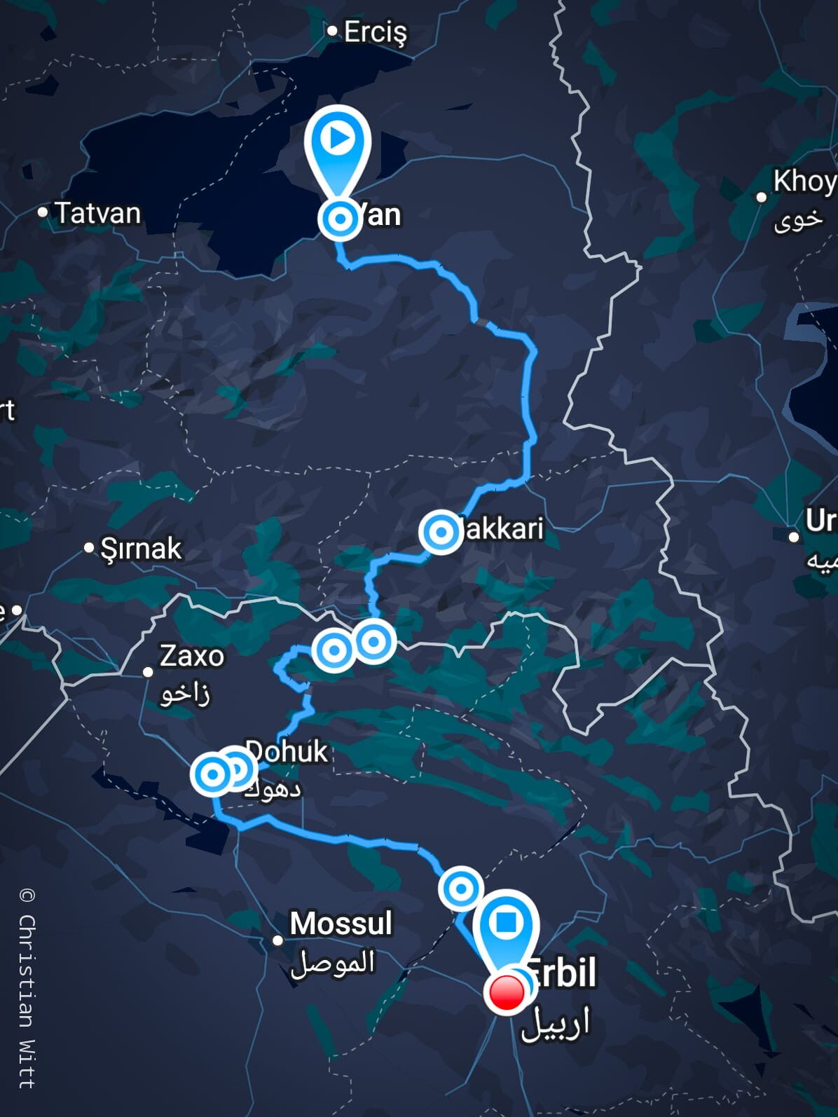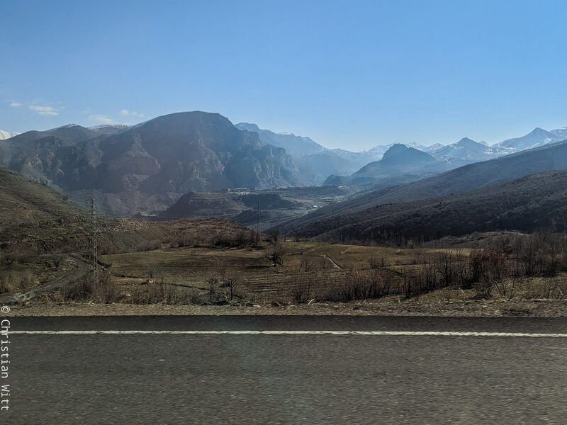 Die Busstrecke Van–Erbil erwies sich als sehr anstrengend. Die Fahrt geht durch ein Hochgebirge, das zwar wunderschön ist, aber auch sehr abenteuerlich. In langsamer Fahrt tastet sich der Bus teilweise an abgerutschten Autobahnen vorbei. So war ich am Ende froh, nach zwölf Stunden Fahrt endlich am Ziel zu sein.