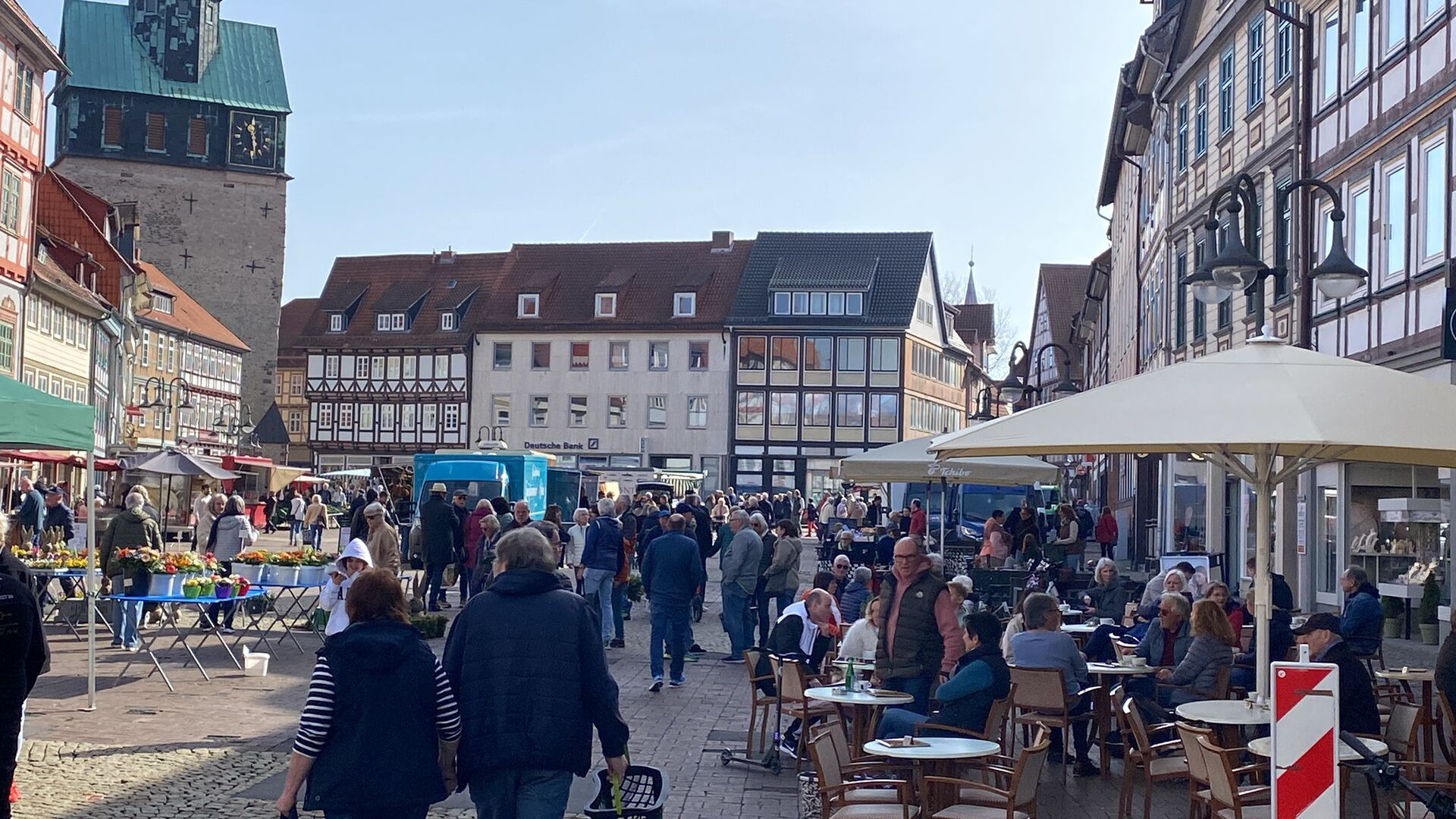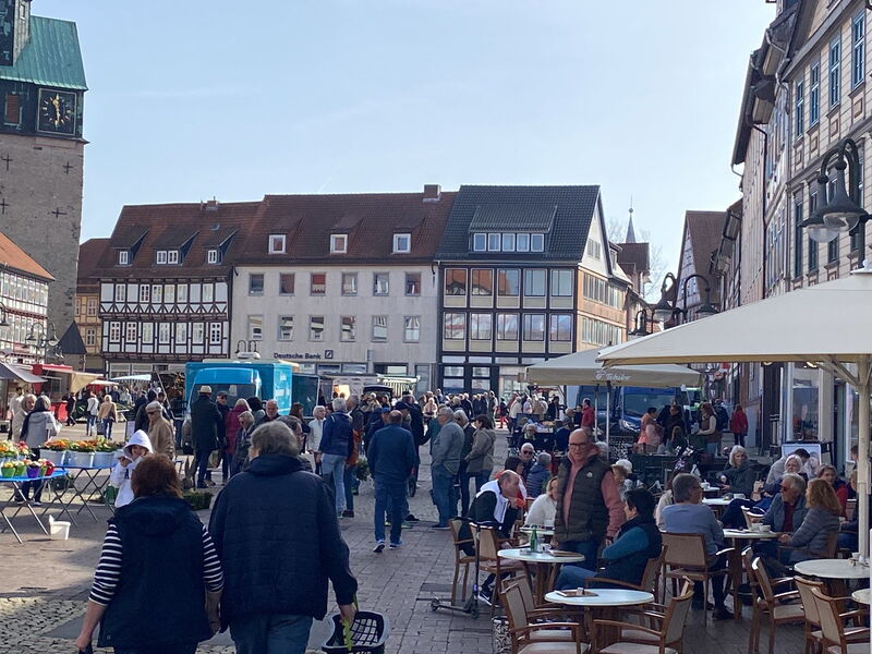 Meine Frau verabschiedete sich zu einem kurzen Zwischenstopp im naheliegenden Drogeriemarkt. Ich saß noch ein bisschen herum und folgte dann neugierig einer laut hörbaren Stimme eines Mannes, die über Mikrofonverstärkung auf dem Osteroder Wochenmarkt übertragen wurde.