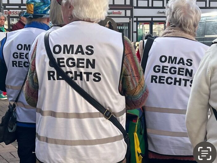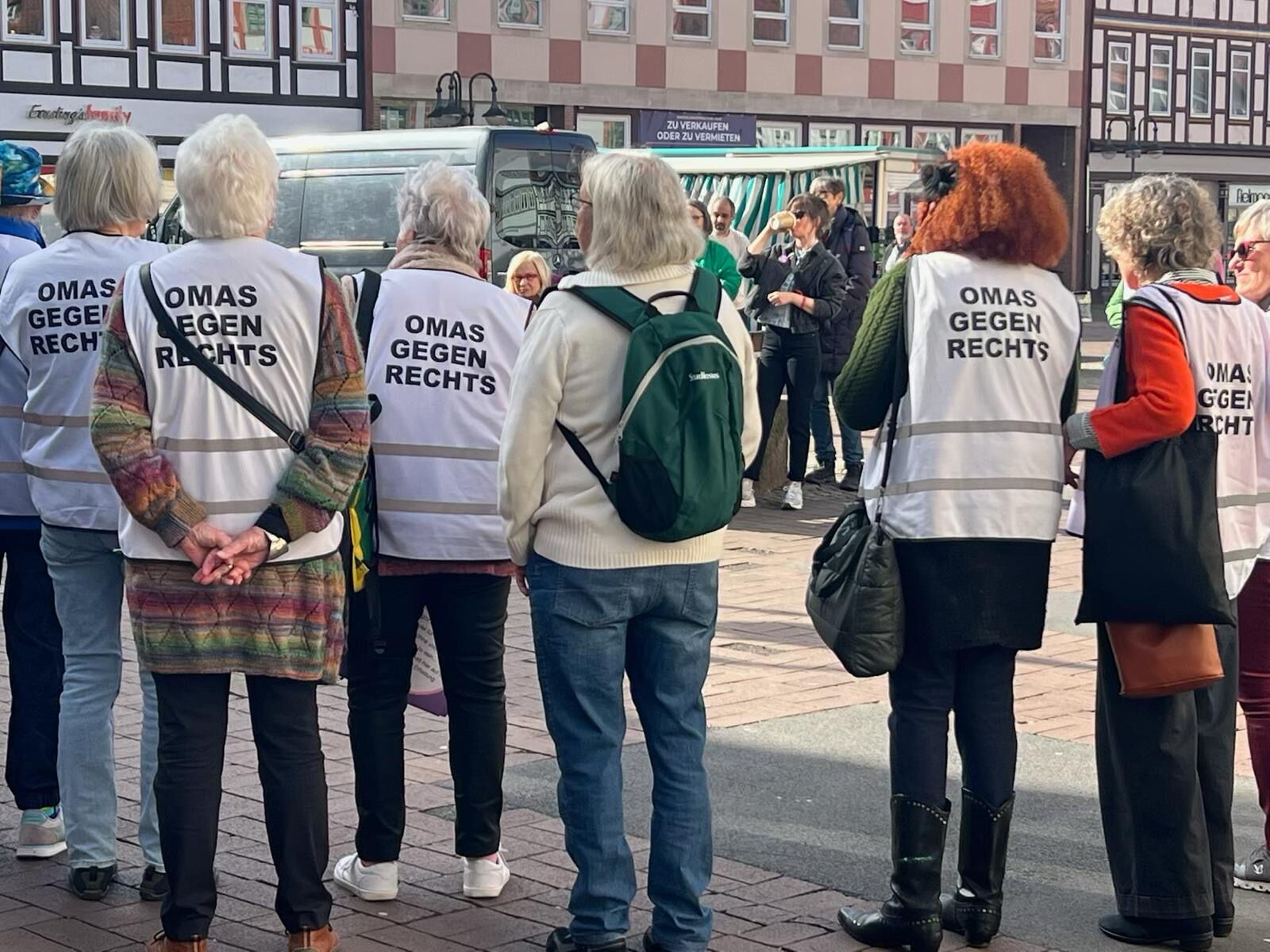 Dort angekommen blickte ich auf die Rücken einer im Kreis stehenden Gruppe von ungefähr einem Dutzend älterer Damen mit weißen Westen, auf denen „Oma gegen Rechts“ geschrieben stand. Ein weiteres Dutzend interessierter Marktbesucher war stehen geblieben, einige Männer, die auf Bänken saßen, ihr Bier tranken oder rauchten, zogen sich nicht zurück, sondern lauschten ebenfalls dem Mann mit dem Mikrofon in der Hand. Beim Näher treten entpuppte der sich als der Bürgermeister von Osterode, der zur Begrüßung der kleinen Versammlung eine Rede hielt und das Engagement am Vortag des Weltfrauentags lobte.