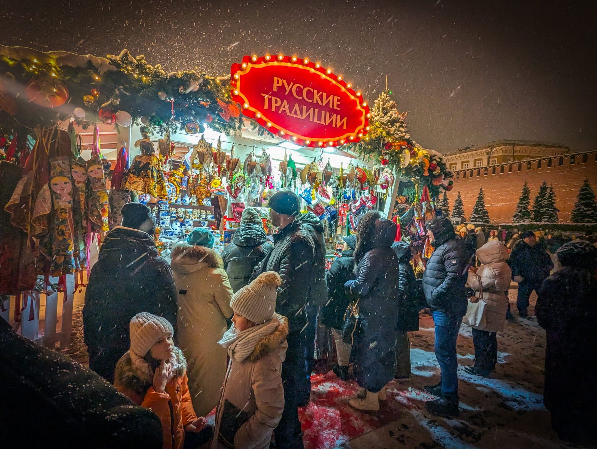Gegrillte Kolbaski, Pfannkuchen, Fettgebäcke und heiße Glüh- sowie Fruchtweine lockten auch in diesem Jahr viele Besucher an. Die Preise sind denen auf unseren Weihnachtsmärkten – wie auch das übrige Preisniveau der Lebensmittel – sehr ähnlich. Trotz des aufreibenden Dauerkrieges im Südwesten und der Sanktionen etlicher Staaten, sehe ich auffällig viele asiatische und indische Touristen. Auch Gäste aus Afrika posieren vor der beeindruckenden Kulisse. Hunderttausende strömen in dieser dunkel-trüben Winterzeit durch die stimmungserhellenden Lichterflure.