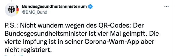 Der Minister also, der keine Auskunft über seinen eigenen Impfstatus geben wollte, nach dem Motto: „Bitte haben Sie Verständnis dafür, dass wir nicht in Details zu medizinischen Angelegenheiten gehen können“, nahm Sonderrechte für sich in Anspruch, die er dem einfachen Volk nicht zubilligt, und outet aus Versehen, dass er mutmaßlich keine vierte Impfung hat, zumindest nicht in seinem Zertifikat.