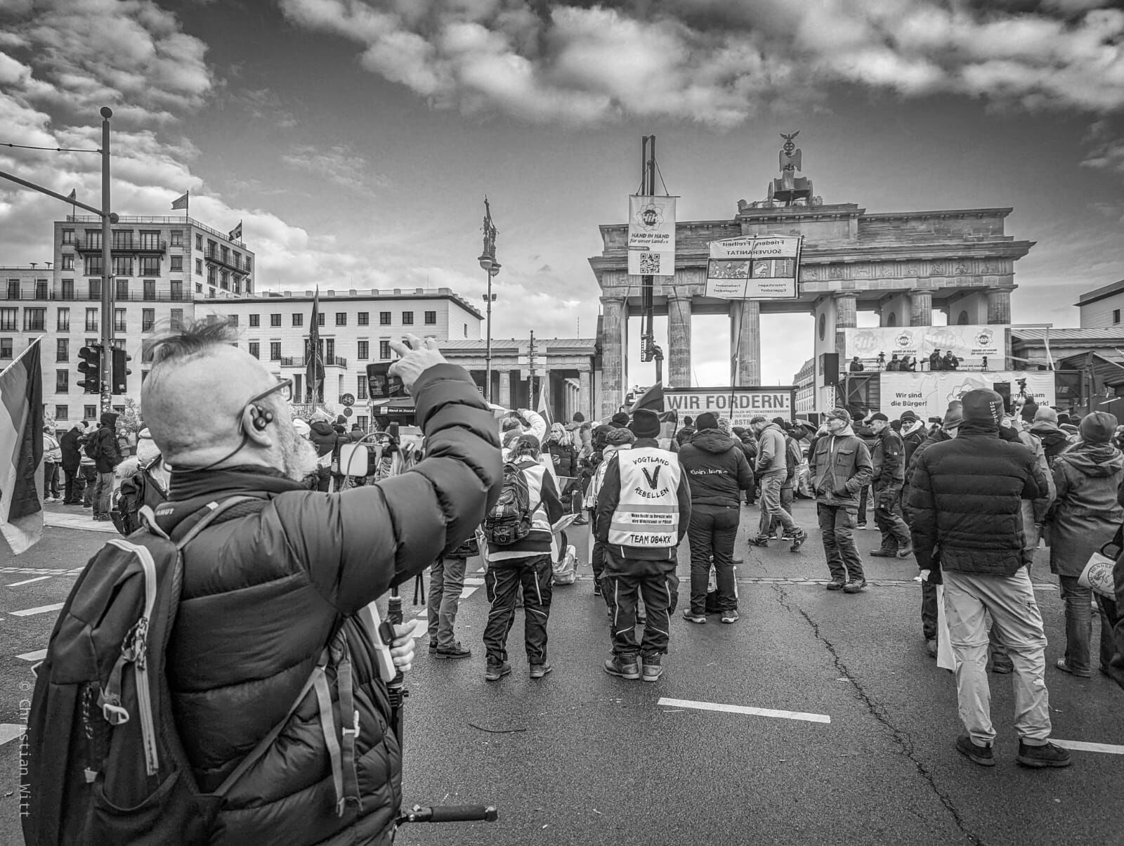 Auf dem Platz vor dem geschichtsträchigten Brandenburger Tor mitten in Berlin haben sich geschätzte zweitausend Menschen und vierhundert Fahrzeuge versammelt. Der Korso reicht bis zum Großen Stern in der Mitte des Tiergartens. Es hätten mehr sein sollen und können.