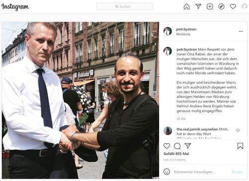 Nach Selbstbekunden Bystrons sollen diese Bilder zustande gekommen sein, als der kurdisch-stämmige Chia Rabiei in Würzburg am Ort der Horrortat einem oppositionellen persischen Fernsehsender ein Interview gab.