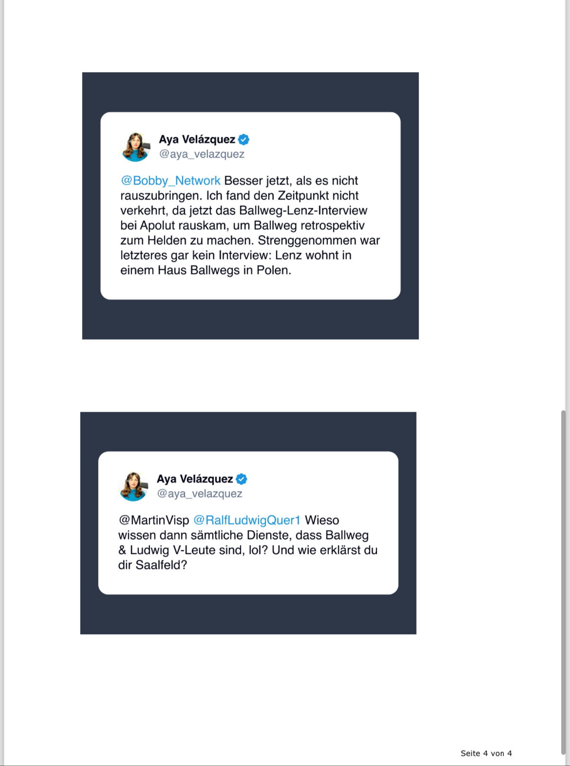 Aya Velázquez unterzeichnet Unterlassungserklärung und zahlt 2590 Euro an Ballweg und Ludwig. Hier die Dokumentation der beiden Unterlassungsaufforderungen.