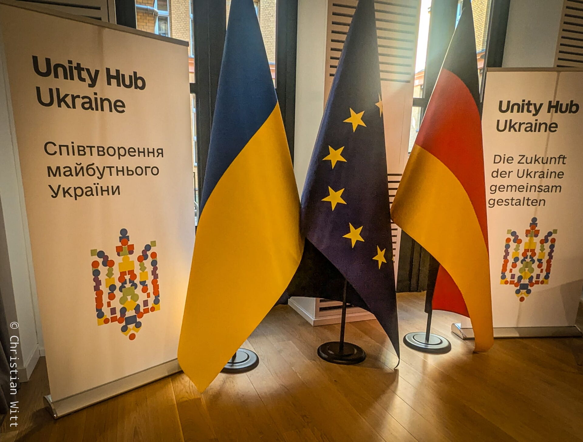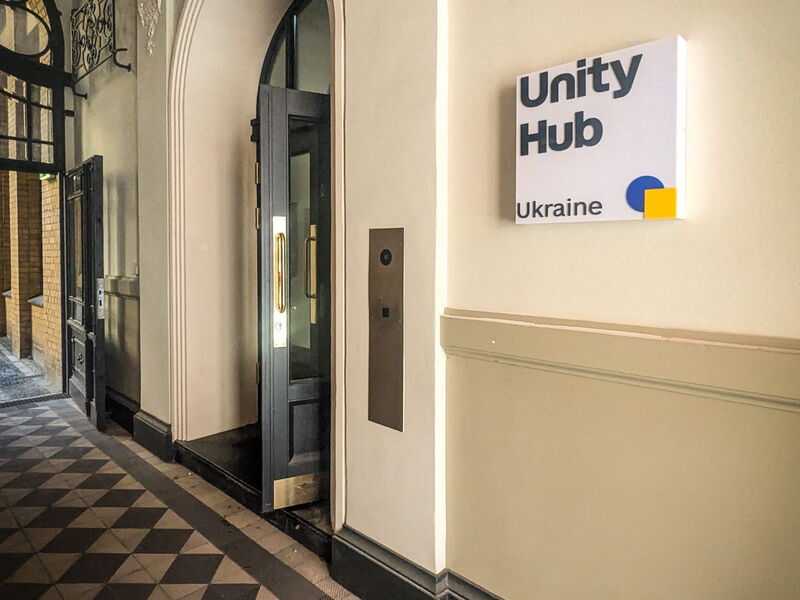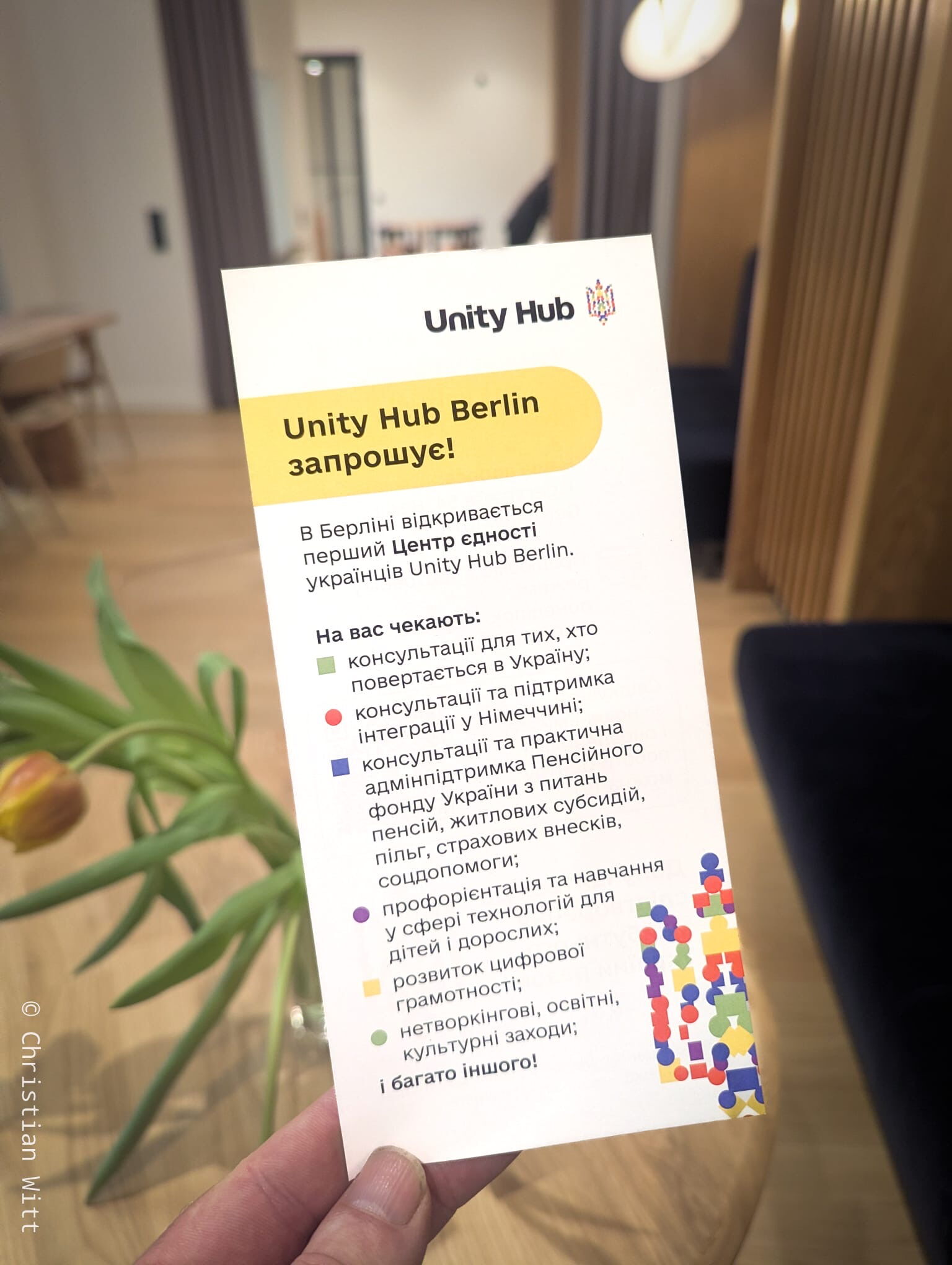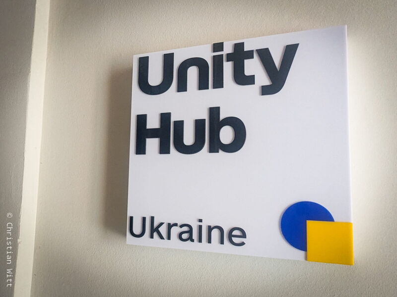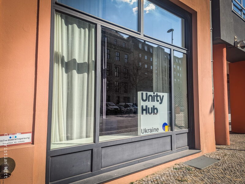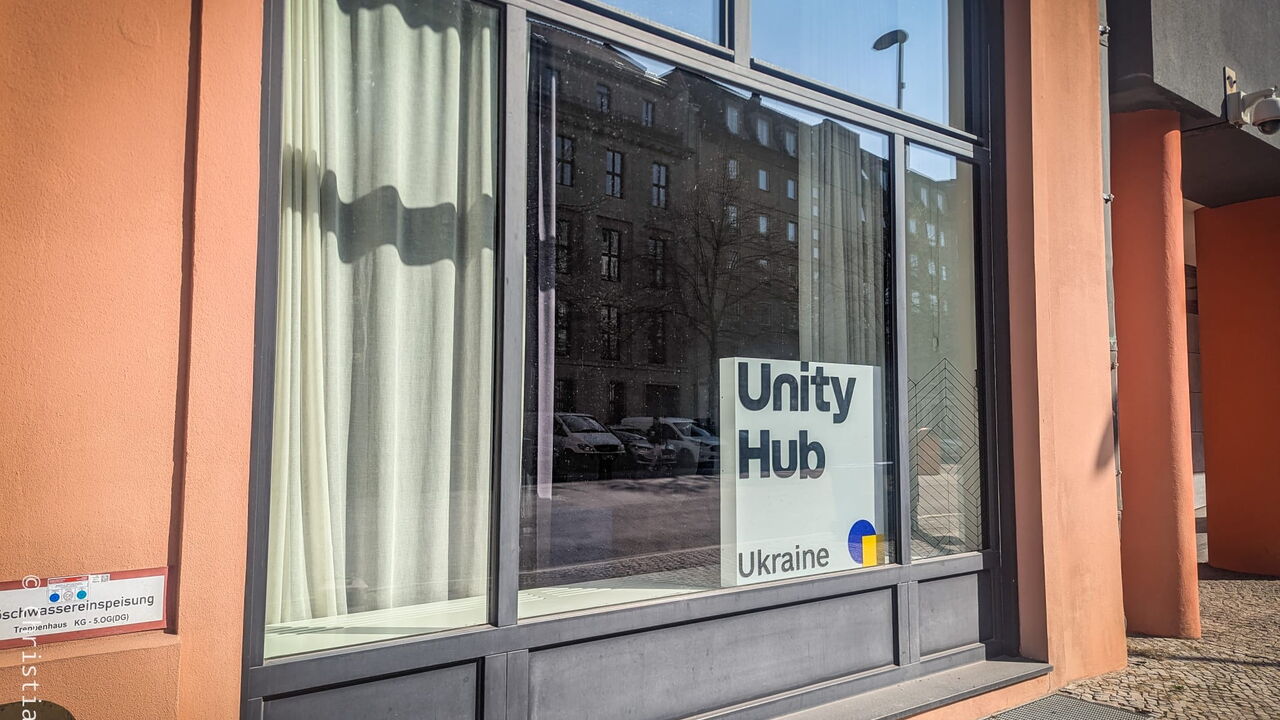 Der Unity Hub der Ukraine – eine ukrainische Behörde auf deutschem Boden – liegt fußläufig direkt am Gendarmenmarkt in bester Touristenlage. Nebenan finden sich moderne Co-Working-Spaces, die Einrichtung ist nordisch-modern und einladend. Mit über einer Million Ukrainern in Deutschland ist der Adressatenkreis groß. Eine Webseite rät, schnell zu kommen, bevor der Andrang zu groß wird.