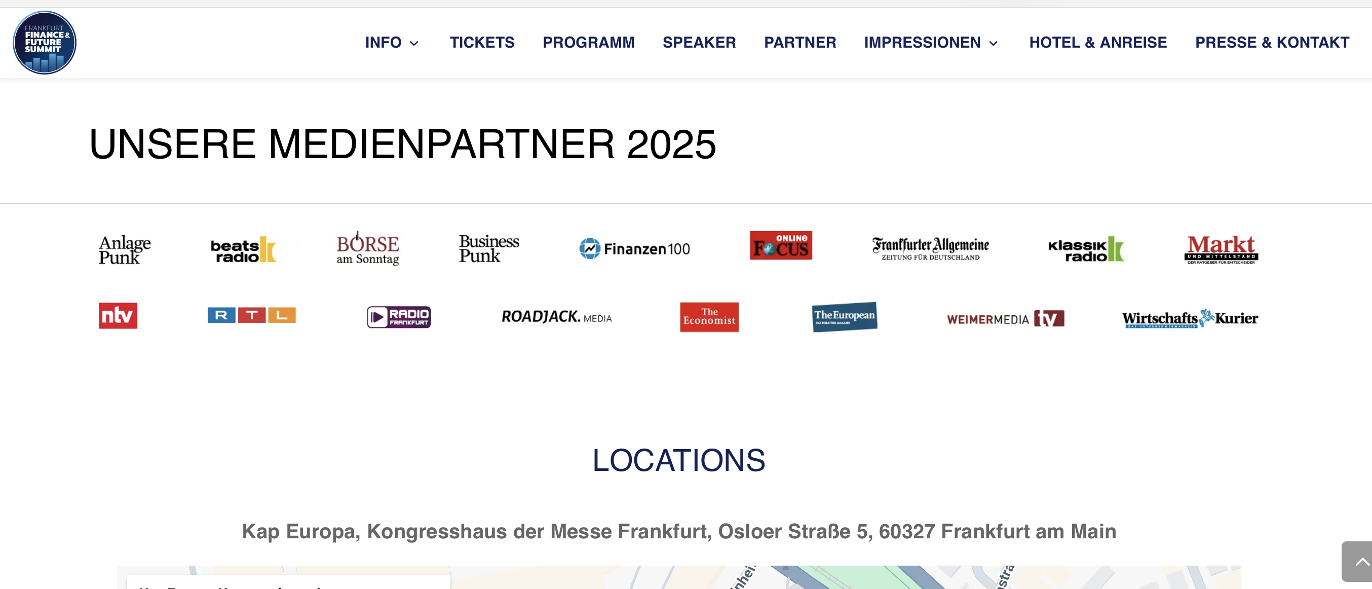 „Unter der Schirmherrschaft des Hessischen Ministerpräsidenten Boris Rhein erleben die Gäste in Frankfurt am Main fünf Events der Extraklasse an zwei Tagen. Am 22. und 23. Oktober 2025 werden in der Main-Metropole Top-Entscheider aus Politik, Wirtschaft, Finanzen, Wissenschaft, Sport und Medien erwartet. Die Gäste erleben die Formate in drei exklusiven Locations: im Städel Museum, Kap Europa und Gibson Club.“