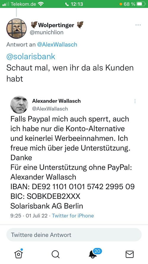 Erwartungsgemäß bringt das die üblichen linksextremistischen Trolle in Wallungen. Ein hier noch einmal besonders stupide wirkender Troll kommentierte: „@solarisbank Schaut mal, wen ihr da als Kunden habt“.