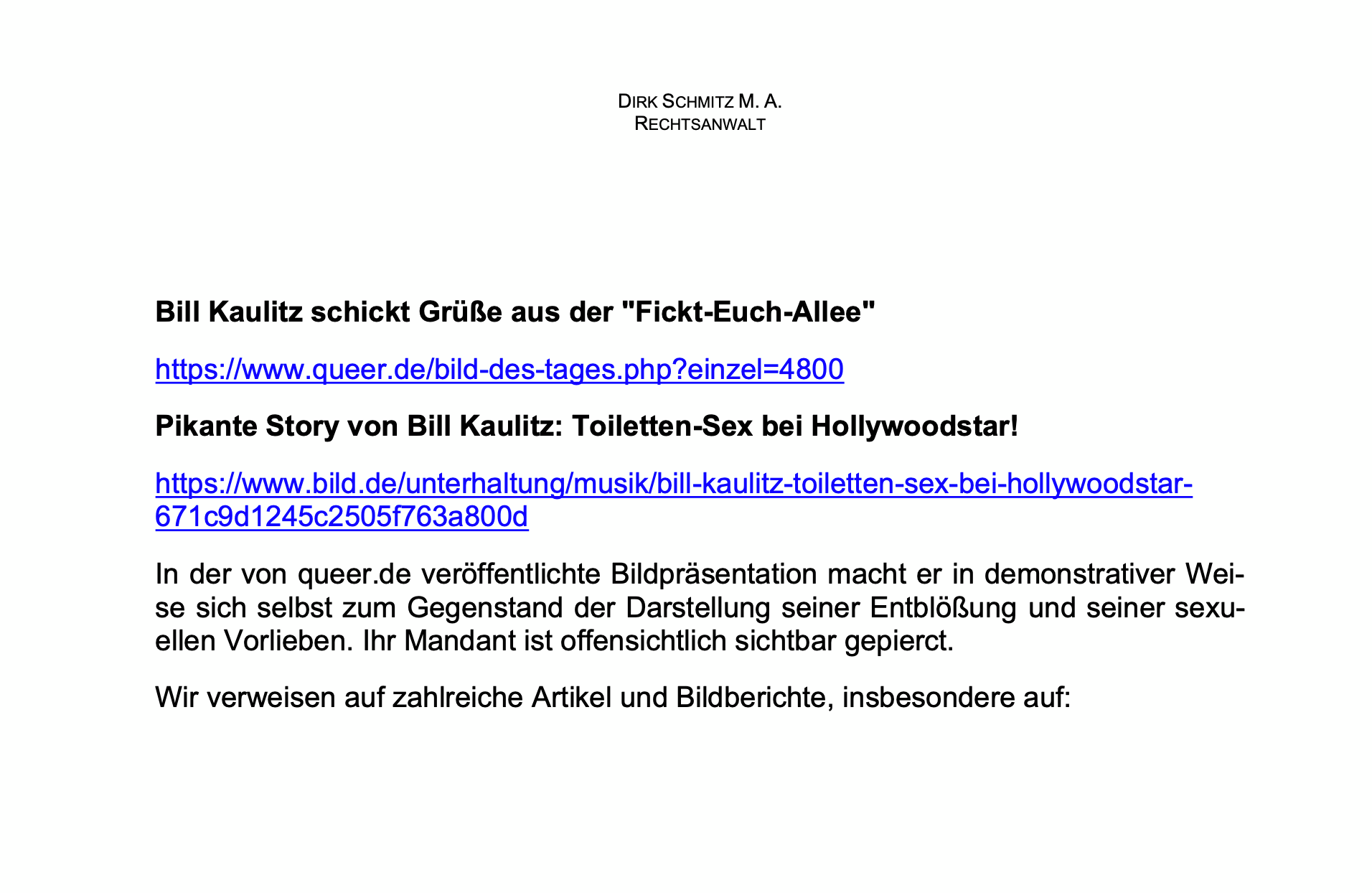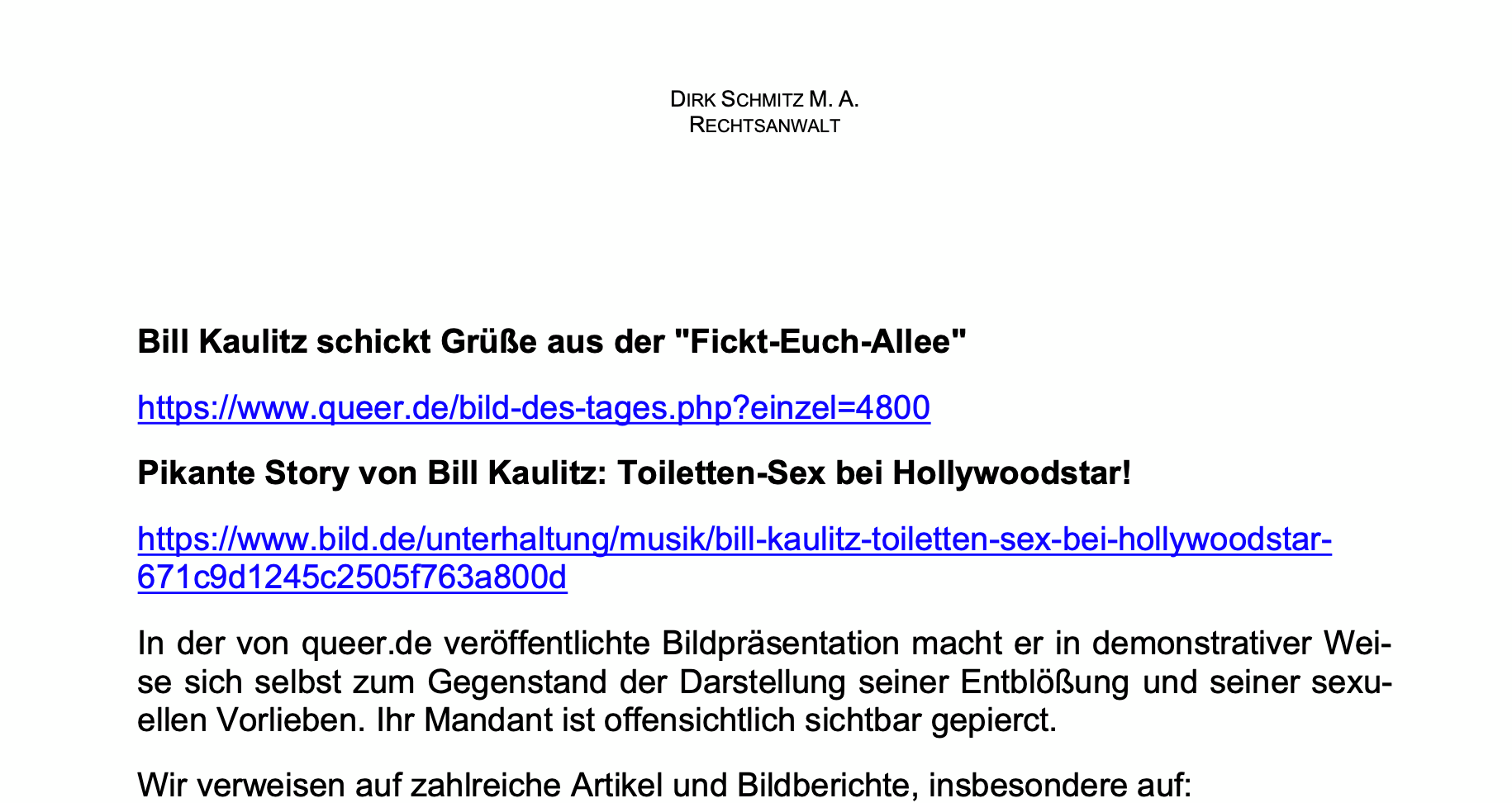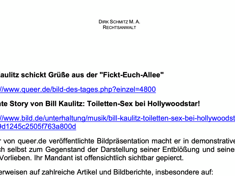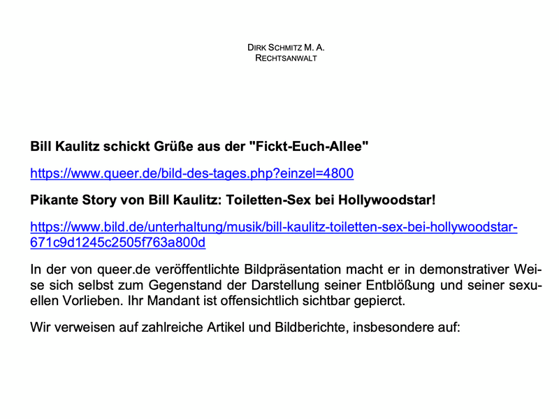 Schmitz legte dem Schreiben sogar Bildmaterial und Links zu Kaulitz’ eigenen Auftritten bei – inklusive Popo-Selfies und Schlagzeilen wie „Bill Kaulitz schickt Grüße aus der Fickt-Euch-Allee“ oder „Toiletten-Sex bei Hollywoodstar“. Kommentar des Anwalts: