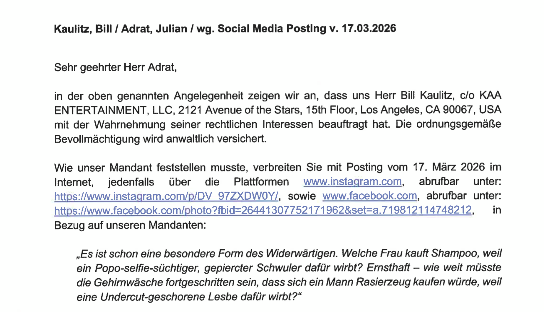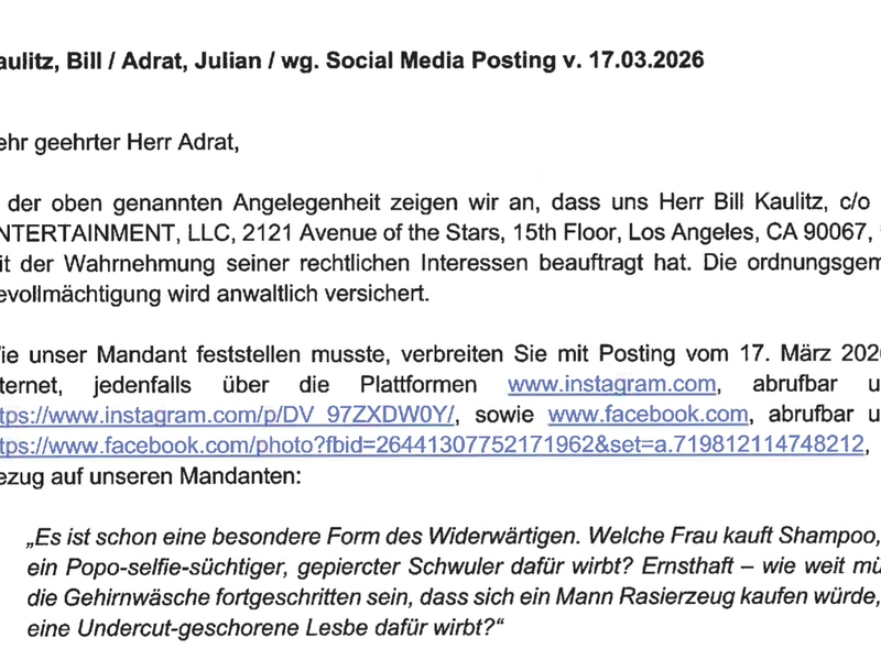 Es ist der klassische Hollywood-Moment: „Wer ist dran?“ – „Hollywood“. Nur dass es diesmal kein Witz war. Der Berliner Autor, Porträtmaler und AfD-Kandidat Julian Adrat bekam tatsächlich Post aus der Avenue of the Stars in Los Angeles. Allerdings nicht von Bill Kaulitz persönlich, sondern von dessen Hamburger Anwälten.