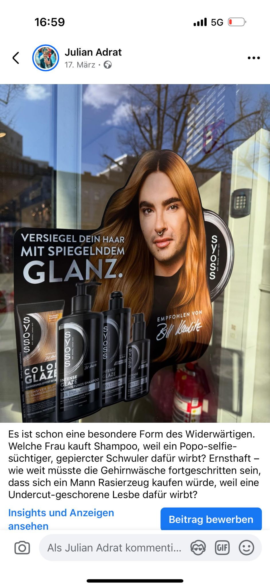 „Es ist schon eine besondere Form des Widerwärtigen. Welche Frau kauft Shampoo, weil ein Popo-selfie-süchtiger, gepiercter Schwuler dafür wirbt? Ernsthaft – wie weit müsste die Gehirnwäsche fortgeschritten sein, dass sich ein Mann Rasierzeug kaufen würde, weil eine Undercut-geschorene Lesbe dafür wirbt?“