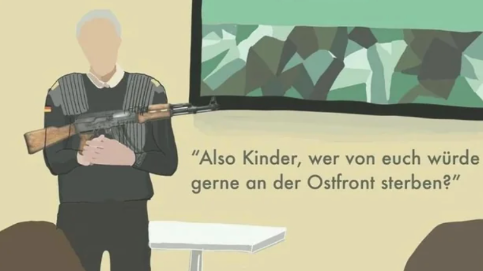 „Das Motiv zeigt einen Jugendoffizier mit Waffe vor einer Schulklasse, darauf der kriegskritische Satz: ‚Also Kinder, wer von euch würde gerne an der Ostfront sterben?‘ ‚Solche Manöver lässt ein gestandenes Heer nicht unbeantwortet, seit dieser Woche wird zurückgeschossen‘, schreibt die Junge Welt dazu.“