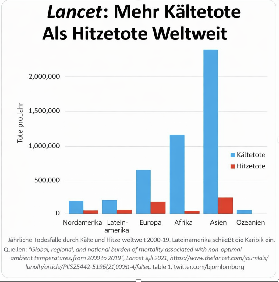 Grafik: Mehr Tote durch Kälte als durch Hitze in allen Erdteilen. Quelle