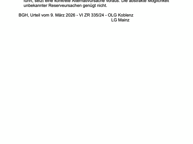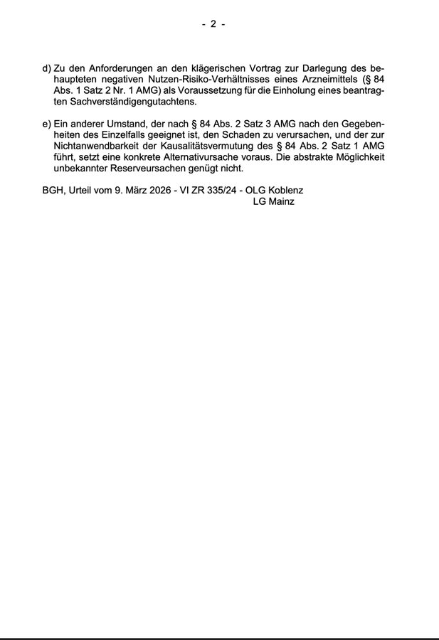 Zahlreiche bisher benutzte Abweisungsformeln sind seit dem 9. März 2026 nicht mehr Stand des Rechts. Über 400 Urteile dürften in der Zwischenzeit rechtwidrig abgewiesen worden sein, die nun alle nicht in Übereinstimmung mit der Rechtsprechung des BGH stehen. Viele davon leider wegen des rechtswidrigen Verhaltens der Rechtsschutzversicherungen rechtskräftig, vor allem der Rechtschutzversicherer Roland, LVM und DEVK u.a., die keine Berufungsverfahren mehr deckten oder die Streitwerte bis zur Unkenntlichkeit bei schwersten gesundheitlichen Schäden kürzten oder die DEVK, die grundsätzlich nie irgendetwas im Impfschadensbereicht deckte und sich damit nun nach Verjährung der Gefahr aussetzt, wegen der rechtswidrigen Deckungsablehnungen dann auf Schadenersatz selbst in Anspruch genommen zu werden.