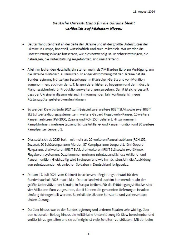 • Deutschland steht fest an der Seite der Ukraine und ist der größte Unterstützer der Ukraine in Europa, finanziell, wirtschaftlich und auch militärisch. Wir werden die Unterstützung so lange fortsetzen, wie dies notwendig ist. Berichterstattungen, die nahelegen, die Unterstützung sei gefährdet, sind unzutreffend.