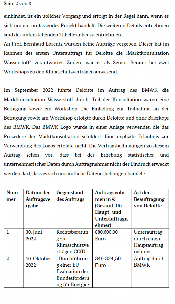 An Prof. Bernhard Lorentz wurden keine Aufträge vergeben. Dieser hat im Rahmen des ersten Unterauftrags für Deloitte die „Marktkonsultation Wasserstoff“ verantwortet, Zudem war er als Senior Berater bei zwei Workshops zu den Klimaschutzverträgen anwesend.